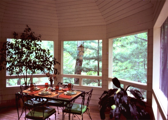 and fireplace with wide doorways (when desired). A two-way stone fireplace and change in floor levels and ceiling heights define living spaces. Wrap around decks connect with screen porch and hot tub porch.