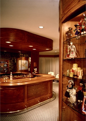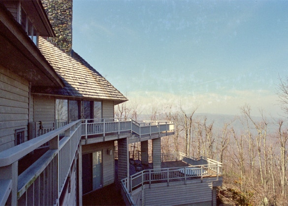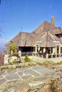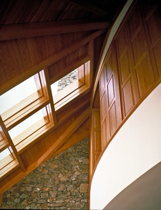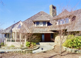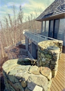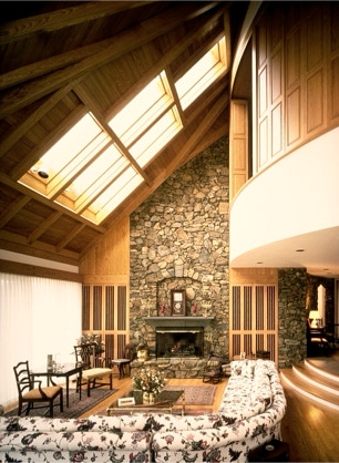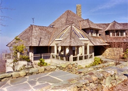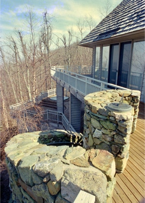 "Sing-Sing-Sing," the name of this Wintergreen Resort, Virginia mountain retreat, aptly describes the harmonious flow within where gently curving walls in smooth natural oak compliment the richly textured surfaces of stone found throughout the house. Interior natural materials echo the rugged