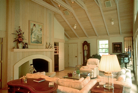 beams balance with pickled oak flooring for a warm and spacious feeling. Large expanses of glass open to the porches along with fireplaces in the great room and bedroom make this a warm weather or cold weather retreat.