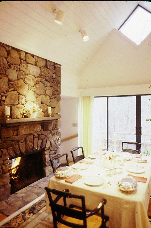and fireplace with wide doorways (when desired). A two-way stone fireplace and change in floor levels and ceiling heights define living spaces. Wrap around decks connect with screen porch and hot tub porch.
