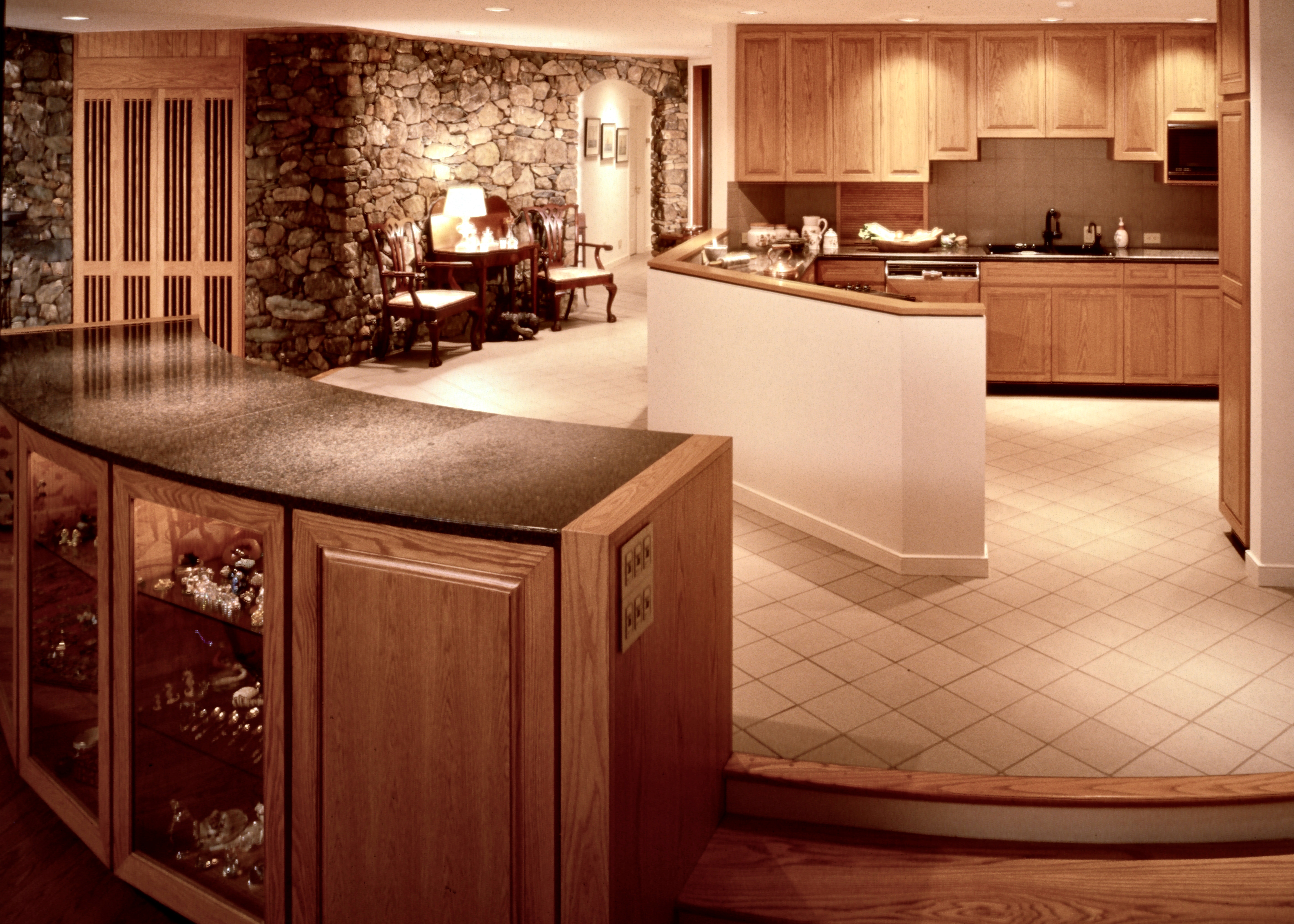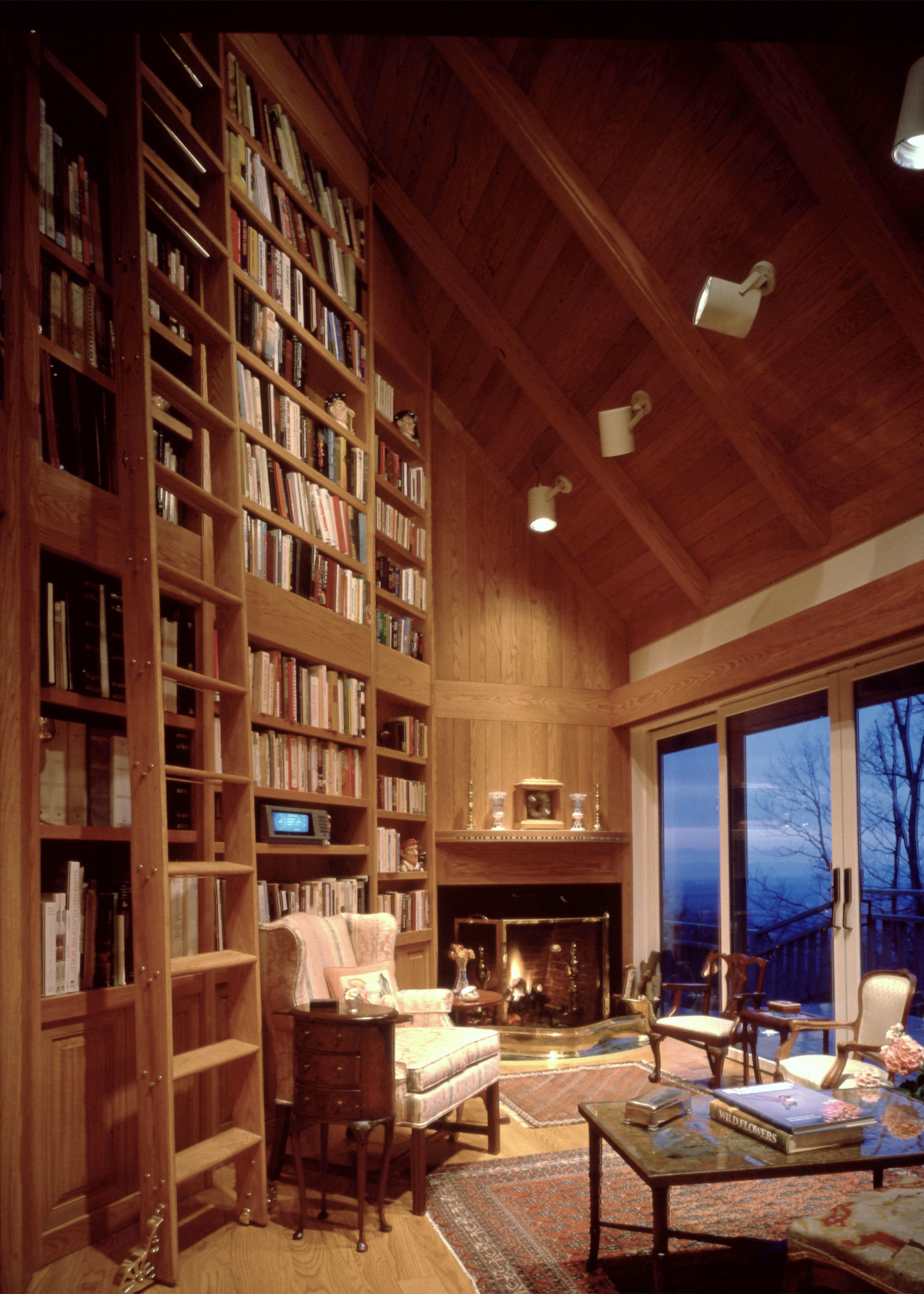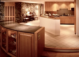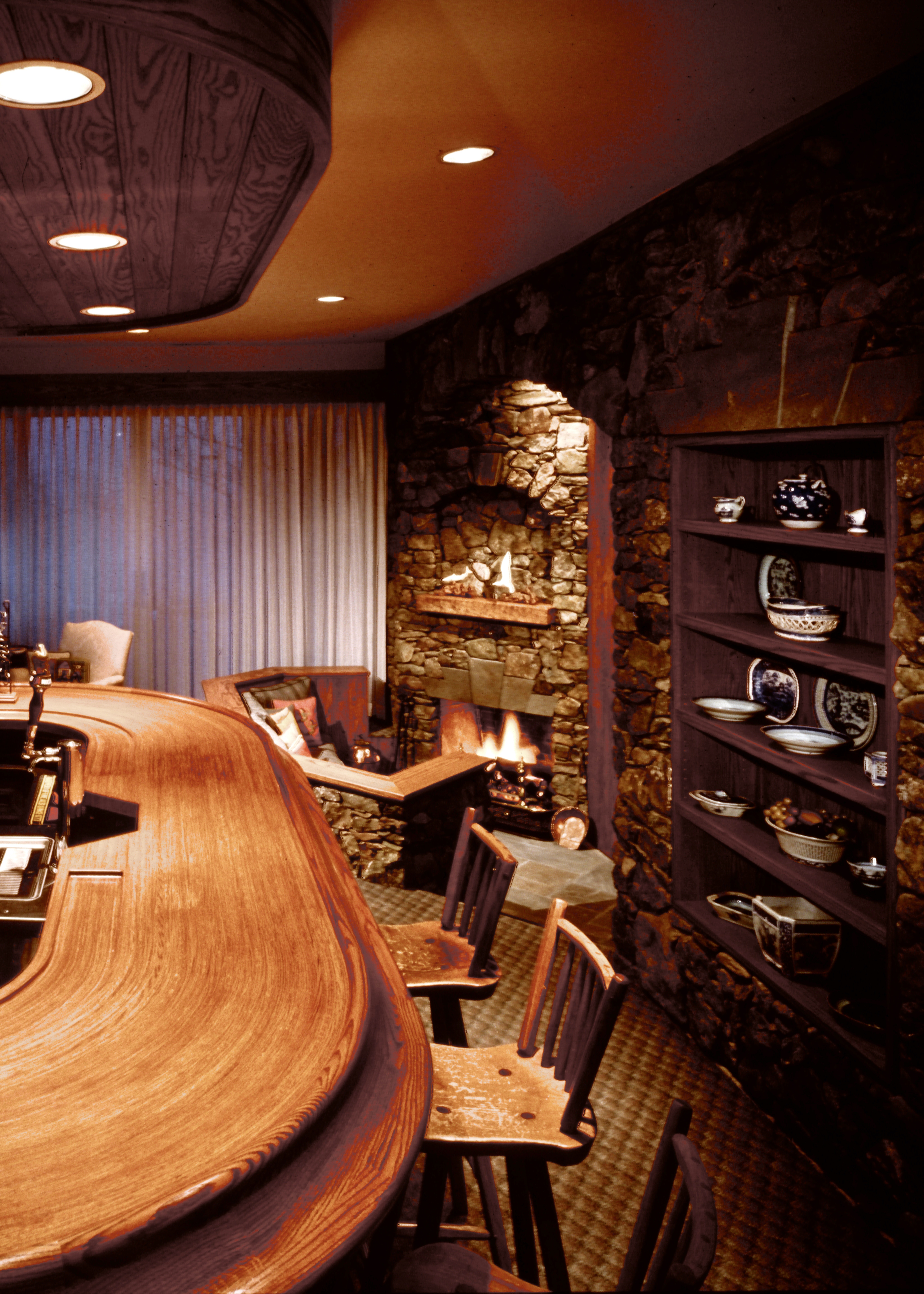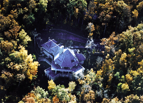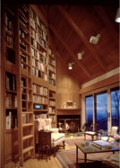 "Sing-Sing-Sing," the name of this Wintergreen Resort, Virginia mountain retreat, aptly describes the harmonious flow within where gently curving walls in smooth natural oak compliment the richly textured surfaces of stone found throughout the house. Interior natural materials echo the rugged
