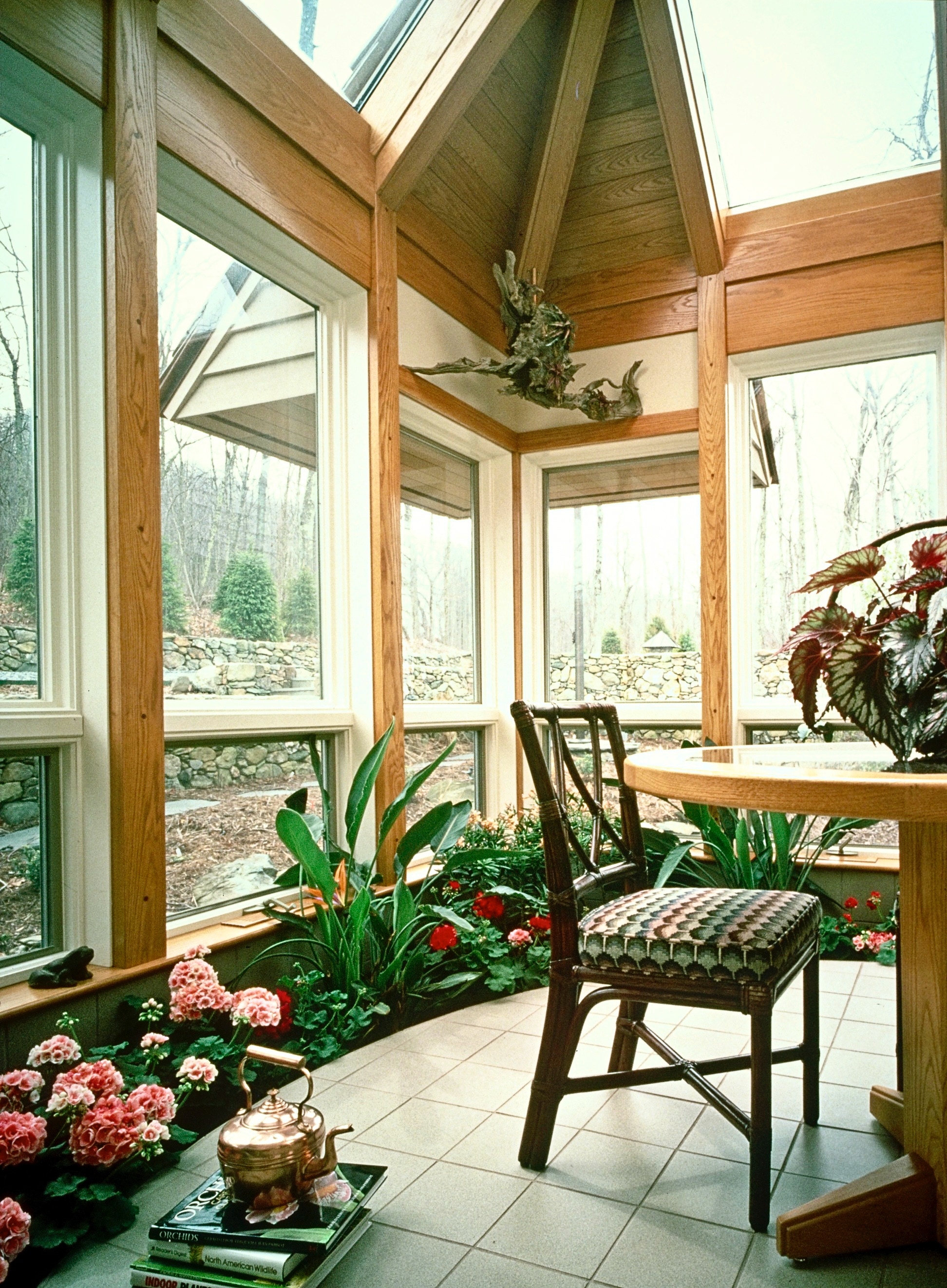 terrain of the mountainside where the house is built. The 180 degree view is captured by wide expanses of glass which helps to bring the outdoors in. The Solarium features an interior border of plants which make it seem like Spring year-round.