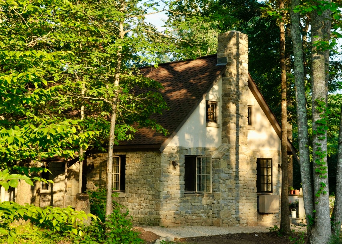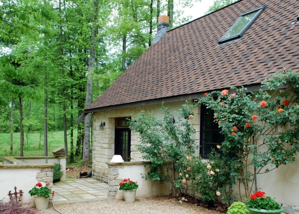 Designed for a stone mason who learned his craft in Corsica, this one bedroom 800 square foot cottage was inspired by turn of the century French Arts and Crafts agricultural structures which were functional, yet elegant in their rural settings. Graced with a limestone exterior, thick stone window sills, radiant heat flooring and an expansive stone
