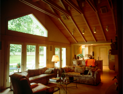 beams balance with pickled oak flooring for a warm and spacious feeling. Large expanses of glass open to the porches along with fireplaces in the great room and bedroom make this a warm weather or cold weather retreat.